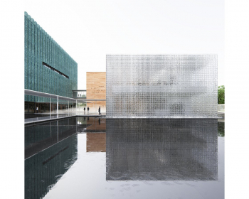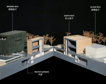 水中浮出三个看似独立的建筑体量:青铜、夯土和玻璃盒子。三个体量又分别跟水面有着不同的关系:一个浮在水上,一个坐在池中,一个嵌入水中上下各一半。半透明的玻璃盒子被安静的流水通体覆盖,水从屋顶流下,顺着四周的玻璃表面一直落到地下二层,往复循环。