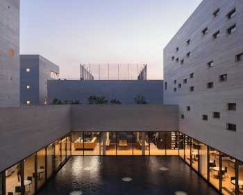 Considering the intensity of the functional programs and the high density of users, the architect decided to break one massive building into five individual buildings connected by flat-roofed walkways. By breaking down and pulling apart, voids are created in the form of four gardens. Between the gardens and the solid volumes are the semi-outdoor walkways where the colonnades and their moving shadows define another kind of void.