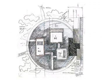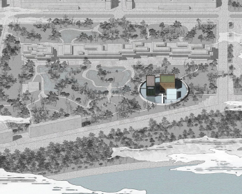 A 90-meter-diameter circular pond is inserted into the existing garden and encircled by a visually semi-transparent covered walkway. Within the water, quiet gushing springs and plasma misting devices active the surface. The circle, without corners, integrating seamlessly with the existing landscape while staging a serene, poetic precinct for the architecture of the new museum.