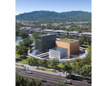 Designed by OPEN Architecture, Shede Culture Museum is located in the East Garden of Shede distillery in Shehong, Sichuan and was topped out in January 2026. On the misty shore of River Fu, where mountains meander, three island-like architectural volumes make their appearances from a vast circular pond, together manifesting the tectonics of the “One Pond, Three Mountains” landscaping ideal that traverses tradition and future.